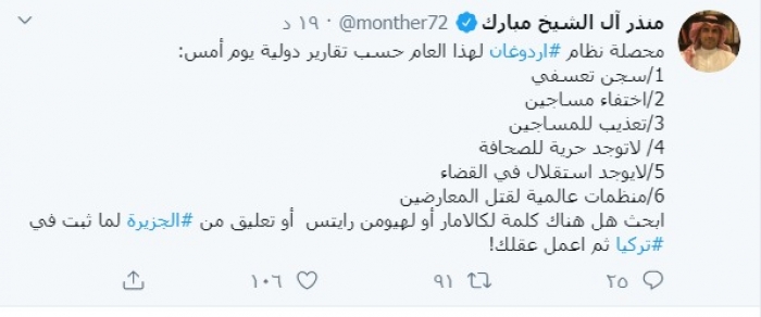 علق المدون السعودي البارز منذر آل الشيخ مبارك، اليوم الخميس، على التقارير الدولية التي تبرز انتهاكات النظام التركي.
