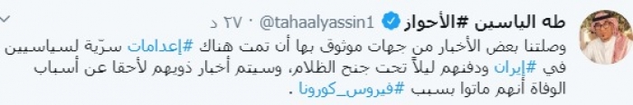 وكتب الياسين عبر تغريدة له على "تويتر" رصدها "المشهد العربي" :"وصلتنا بعض الأخبار من جهات موثوق بها أن تمت هناك إعدامات سرّية لسياسيين في إيران ودفنهم ليلاً تحت جنح الظلام".