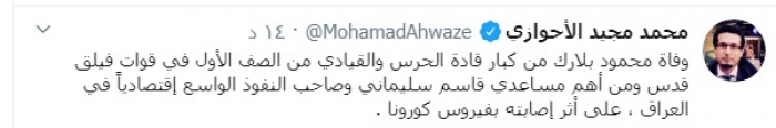 وكتب الصحفي محمد مجيد الأحوازي عبر تغريدة له على "تويتر" رصدها "المشهد العربي":وفاة محمود بلارك من كبار قادة الحرس والقيادي من الصف الأول في قوات فيلق قدس ومن أهم مساعدي قاسم سليماني وصاحب النفوذ الواسع اقتصاديا في العراق ، على أثر إصابته بفيروس كورونا".