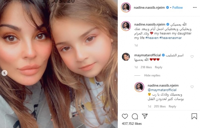 نشرت الفنانة اللبنانية نادين نسيب نجيم، عبر حسابها الرسمي بموقع إنستجرام، صور بصحبة ابنتها الكبرى "هافن".