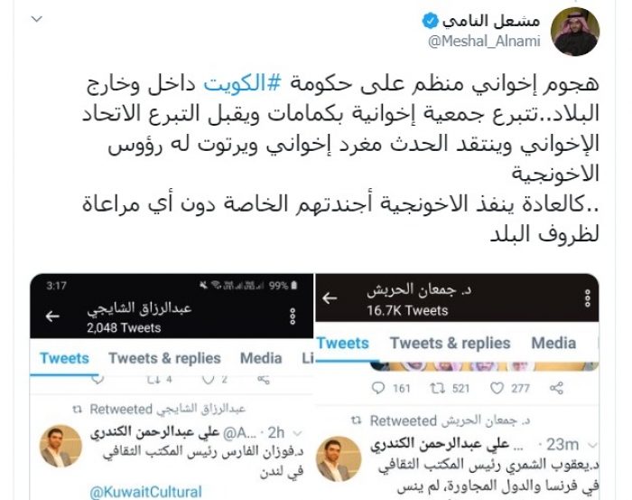 وقال النامي في تغريدة نشرها عبر حسابه الشخصي بـ"تويتر" رصدها "المشهد العربي": "هجوم إخواني منظم على حكومة الكويت داخل وخارج البلاد، تتبرع جمعية إخوانية بكمامات ويقبل التبرع الاتحاد الإخواني وينتقد الحدث مغرد إخواني ويرتوت له رؤوس الاخونجية".