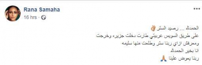 وعلقت: "الحمدلله، رصيد الستر، على طريق السويس عربيتي طارت دخلت جزيرة وخرجت ومعرفش إزاي ربنا ستر وطلعت منها سليمة، أنا بخير الحمد لله، ربنا يعوض علينا".