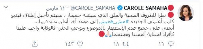 وكتبت "كارول" عبر حسابها الرسمي بموقع تويتر: "نظرا للظروف الصحية والقلق الذي نعيشه جميعا، سيتم تأجيل إطلاق فيديو كليب أغنيتي الجديدة مش هعيش، إلى موعد آخر أعلن عنه قريبا".