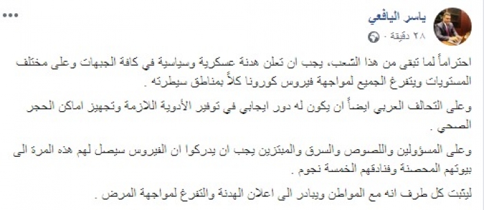 وكتب اليافعي عبر تدوينة له على "فيس بوك" رصدها "المشهد العربي":"احتراماً لما تبقى من هذا الشعب، يجب أن تعلن هدنة عسكرية وسياسية في كافة الجبهات وعلى مختلف المستويات ويتفرغ الجميع لمواجهة فيروس كورونا كلاً بمناطق سيطرته" .
