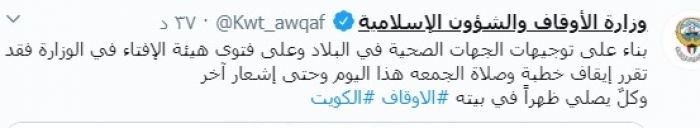 قررت وزارة الأوقاف والشئون الإسلامية في الكويت إلغاء صلاة الجمعة، كإجراء احترازي للحد من انتشار فيروس كورونا.