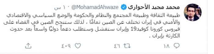 وكتب في تغريدة له على "تويتر" رصدها "المشهد العربي":"طبيعة الثقافة وطبيعة المجتمع والنظام والحكومة والوضع السياسي والاقتصادي والأمني في إيران تختلف عن الصين تمامًا".