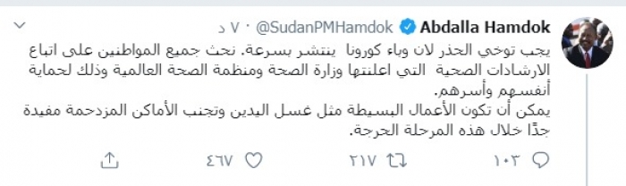 وكتب حمدوك عبر تغريدة له على "تويتر" رصدها "المشهد العربي": "كما قال السيد تيدروس مدير منظمة الصحة العالمية ، هذا مرض يمكن السيطرة عليه ، وأؤكد لكم أن كل الجهات المعنية مستعدة لتنفيذ خطة الاستعداد والاستجابة الشاملة للتصدي لوباء كورونا"