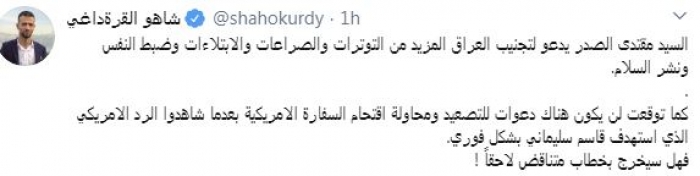 وقال في تغريدة عبر "تويتر" رصدها "المشهد العربي": "السيد مقتدى الصدر يدعو لتجنيب العراق المزيد من التوترات والصراعات والابتلاءات وضبط النفس ونشر السلام".