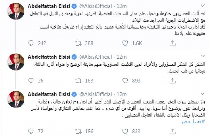 وقال في تغريدات عبر "تويتر" رصدها "المشهد العربي": "لقد أثبت المصريون حكومة وشعبا، على مدار الساعات الماضية، قدرتهم القوية ومعدنهم النبيل في التعامل مع الاضطرابات الجوية التي اجتاحت البلاد. فقد أدارت الدولة بأجهزتها التنفيذية ومؤسساتها الأمنية مشهدا بالغ التعقيد إزاء ظروف مناخية ليست معهودة على بلادنا".