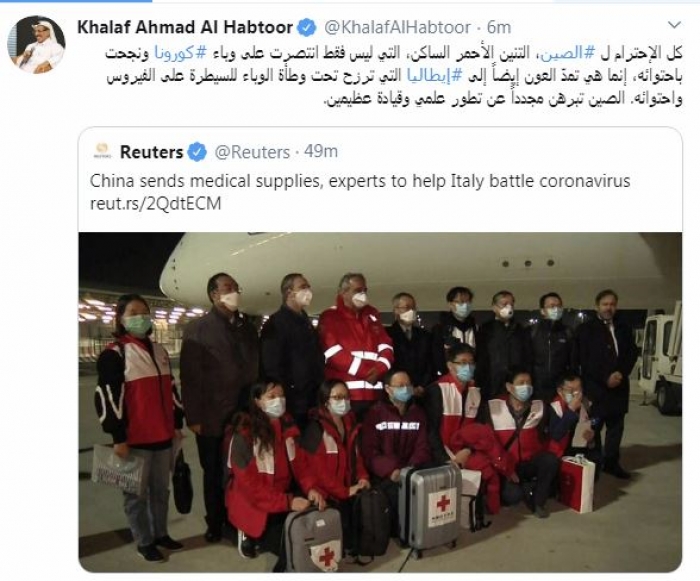 وقال في تغريدة عبر "تويتر" رصدها "المشهد العربي": "كل الاحترام للصين، التنين الأحمر الساكن، التي ليس فقط انتصرت على وباء كورونا ونجحت باحتوائه، إنما هي تمدّ العون إيضاً إلى إيطاليا التي ترزح تحت وطأة الوباء للسيطرة على الفيروس واحتوائه. الصين تبرهن مجدداً عن تطور علمي وقيادة عظيمين".