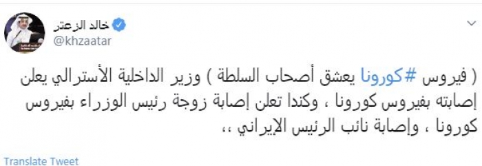 وقال في تغريدة عبر "تويتر" رصدها "المشهد العربي": "(فيروس كورونا يعشق أصحاب السلطة) وزير الداخلية الأسترالي يعلن إصابته بفيروس كورونا، وكندا تعلن إصابة زوجة رئيس الوزراء بفيروس كورونا، وإصابة نائب الرئيس الإيراني".