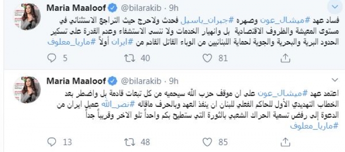وقالت في تغريدات عبر "تويتر" رصدها "المشهد العربي": "اعتمد عهد ميشال عون على أن موقف حزب الله سيحميه من كل تبعات قادمة بل واضطر بعد الخطاب التهديدي الأول للحاكم الفعلي للبنان أن ينفذ العهد وبالحرف ما قاله نصر الله عميل إيران من الدعوة إلى رفض تسمية الحراك الشعبي بالثورة التي ستطيح بكم واحداً تلو الاخر وقريباً جداً".