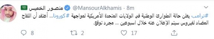 وقال في تغريدة عبر "تويتر" رصدها "المشهد العربي": "ترامب يعلن حالة الطوارئ الوطنية في الولايات المتحدة الأمريكية لمواجهة كورونا... أعتقد أن اللقاح المضاد لفيروس سيتم الإعلان عنه خلال أسبوعين ... مجرد توقع".