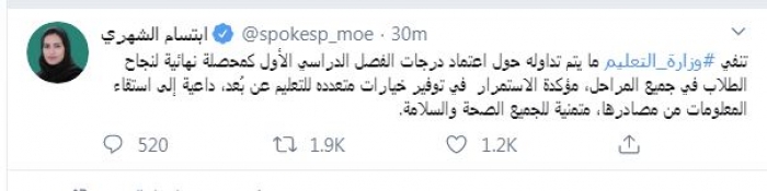 نفت المتحدثة باسم وزارة التعليم بالمملكة العربية السعودية ابتسام الشهري، ما يتم تداوله بشأن اعتماد درجات الفصل الدراسي الأول كمحصلة نهائية لنجاح الطلاب في جميع المراحل.