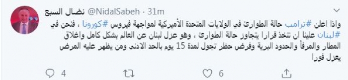 وقال في تغريدة عبر "تويتر" رصدها "المشهد العربي": "وإذا أعلن ترامب حالة الطوارئ في الولايات المتحدة الأميركية لمواجهة فيروس كورونا، فنحن في لبنان علينا أن نتخذ قرارًا يتجاوز حالة الطوارئ، وهو عزل لبنان عن العالم بشكل كامل وإغلاق المطار والمرفأ والحدود البرية وفرض حظر تجول لمدة 15 يوم بالحد الأدنى ومن يظهر عليه المرض يعزل فورًا".