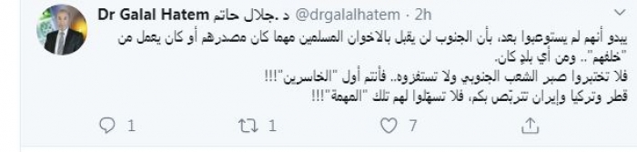 وكتب في تغريدة عبر "تويتر" رصدها "المشهد العربي": "يبدو أنهم لم يستوعبوا بعد، بأن الجنوب لن يقبل بالاخوان المسلمين مهما كان مصدرهم أو من كان يعمل خلفهم.. ومن أي بلدٍ كان".