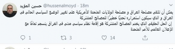 وقال في تغريدة عبر "تويتر" رصدها "المشهد العربي": "يمكن أن تلتقي مصلحة العراق ومصلحة الولايات المتحدة الأمريكية على تغيير الوضع السياسي الحالي في العراق و الذي سيكون استمراره تحديًا خطيرًا للمصالح المشتركة".