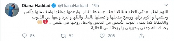 وكتبت ديانا: "اللهم اغفر لجدتي الحنونة فلقد لحف جسدها التراب وارحمها وعافها واعف عنها وآنس وحشتها وأكرم نزلها ووسع مدخلها واغسلها بالماء والثلج والبرد ونقها من الذنوب والخطايا كما ينقى الثوب الأبيض من الدنس واجعل روحها في عليين، رحمك الله جدتي وحبيبتي يا ريحة أمي الغالية".