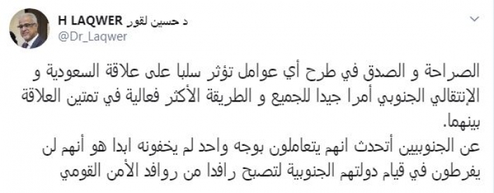 وكتب في تغريدة عبر "تويتر" رصدها "المشهد العربي": "الصراحة والصدق في طرح أي عوامل تؤثر سلبًا على علاقة السعودية والانتقالي الجنوبي أمرًا جيدًا للجميع والطريقة الأكثر فعالية في تمتين العلاقة بينهما".