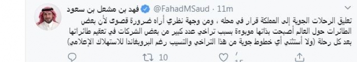أشاد الأمير السعودي البارز فهد بن مشعل بن مسعود، اليوم، بقرار المملكة العربية السعودية بتعليق الرحلات الجوية.