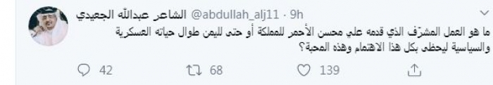 وقال في تغريدة عبر "تويتر" رصدها "المشهد العربي": "ما هو العمل المشرّف الذي قدمه علي محسن الأحمر للمملكة أو حتى لليمن طوال حياته العسكرية والسياسية ليحظى بكل هذا الاهتمام وهذه المحبة؟".