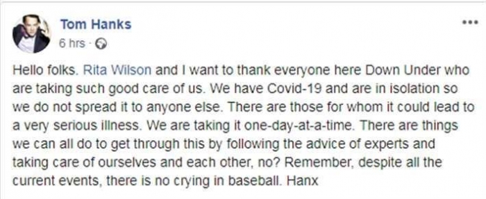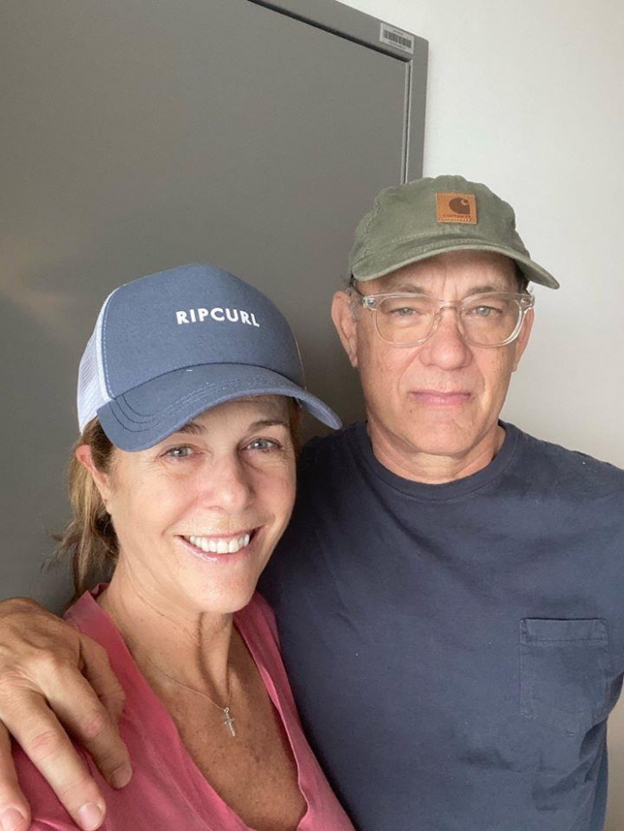 ونشر هانكس صورة تجمعه بزوجته ريتا ويلسون، وعلق عليها: "أنا وريتا نرغب في شكر كل من يرعانا، ونحن موجودين في العزل بسبب كورورنا، حتى لا ننقل العدوى لشخص آخر".