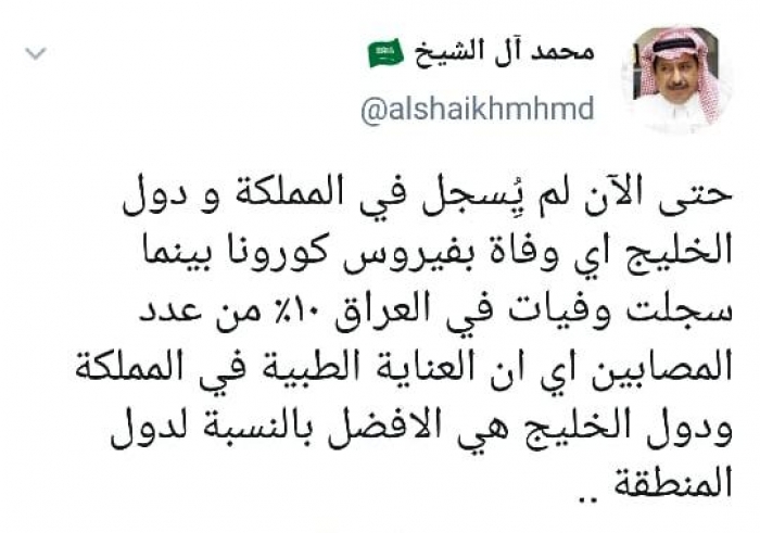 وقال في تغريدة عبر "تويتر" رصدها "المشهد العربي": "حتى الآن لم يُِسجل في المملكة ودول الخليج أي وفاة بفيروس كورونا بينما سجلت وفيات في العراق ١٠٪ من عدد المصابين أي أن العناية الطبية في المملكة ودول الخليج هي الأفضل بالنسبة لدول المنطقة".