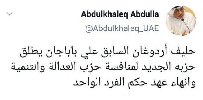وكتب في تغريدة عبر "تويتر" رصدها "المشهد العربي": "حليف أردوغان السابق علي باباجان يطلق حزبه الجديد لمنافسة حزب العدالة والتنمية وإنهاء عهد حكم الفرد الواحد".