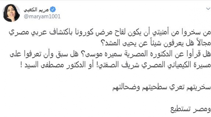 قالت الكاتبة الإماراتية مريم الكعبي، اليوم، إن مصر تستطيع إنتاج لقاح مضاد لفيروس كورونا، مؤكدةً في الوقت ذاته أن مصر تمتلك مجموعة من العلماء أمثال سميرة موسى وشريف الصفتي ومصطفى السيد وغيرهم.
