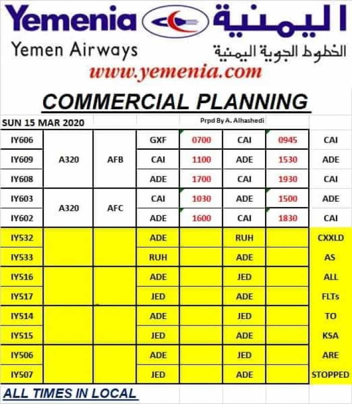 تنطلق غدا الأحد، 5 رحلات لطيران اليمنية، من وإلى القاهرة من مطاري العاصمة عدن الدولي وسيئون.