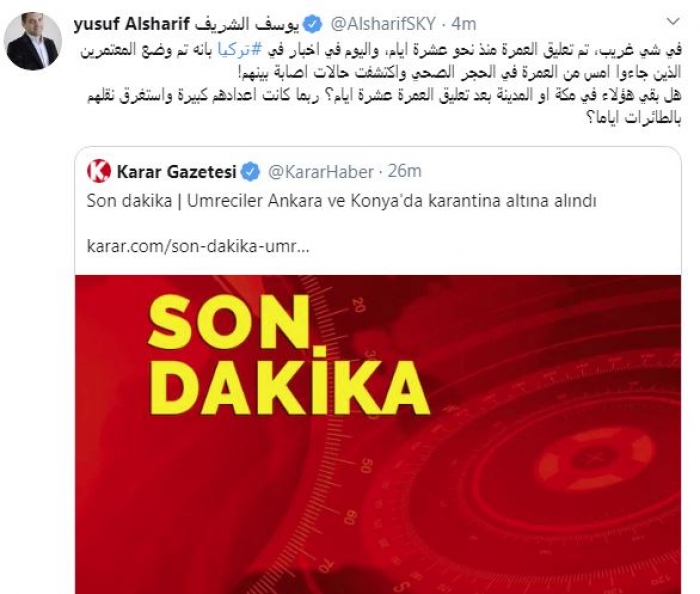 وقال في تغريدة عبر "تويتر" رصدها "المشهد العربي": "في شي غريب، تم تعليق العمرة منذ نحو عشرة ايام، واليوم في أخبار في تركيا بأنه تم وضع المعتمرين الذين جاءوا أمس من العمرة في الحجر الصحي واكتشفت حالات إصابة بينهم".