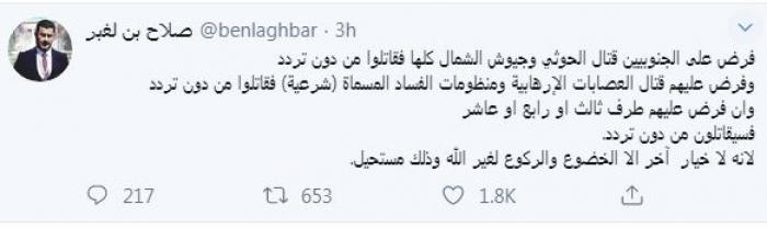 قال الإعلامي صلاح بن لغبر، اليوم، إن القتال فرض على الجنوبيين مجابهة مليشيات الحوثي والعصابات الإرهابية فقاتلوا دون تردد، مشيرًا إلى أنه لا خيار آخر إلا الخضوع والركوع لغير الله.