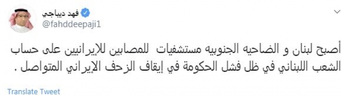 وكتب في تغريدة عبر "تويتر" رصدها "المشهد العربي": "أصبح لبنان والضاحية الجنوبية مستشفيات للمصابين للإيرانيين على حساب الشعب اللبناني في ظل فشل الحكومة في إيقاف الزحف الإيراني المتواصل".