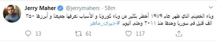 وكتب في تغريدة عبر "تويتر" رصدها "المشهد العربي": "وباء الخميني الذي ظهر عام ١٩٧٩ أخطر بكثير من وباء كورونا والأسباب نعرفها جميعنا وأبرزها ٣٥٠ ألف قتيل في سوريا وحدها منذ ٢٠١١ وحتى اليوم".