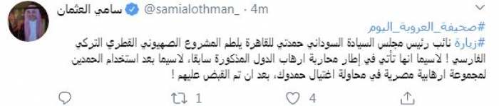وأضاف: "لاسيما أنها تأتي في إطار محاربة إرهاب الدول المذكورة سابقا، لاسيما بعد استخدام الحمدين لمجموعة إرهابية مصرية في محاولة اغتيال حمدوك، بعد أن تم القبض عليهم".