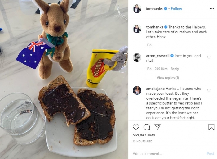 يحرص النجم العالمي توم هانكس، على تزويد جمهوره بآخر المستجدات حول حالته الصحية بعدما أعلن إصابته هو وزوجته بفيوس كورونا المستجد، ومؤخرا نشر هانكس صورة للطعام الذي يتناوله في الحجر الصحي الذي يمكث فيه برفقة زوجته ريتا بأمر الأطباء في أستراليا.