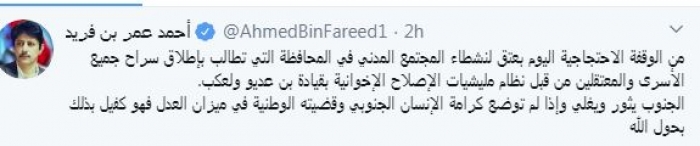 وقال في تغريدة عبر "تويتر" رصدها "المشهد العربي": "من الوقفة الاحتجاجية اليوم بعتق لنشطاء المجتمع المدني في المحافظة التي تطالب بإطلاق سراح جميع الأسرى والمعتقلين من قبل نظام مليشيات الإصلاح الإخوانية بقيادة بن عديو ولعكب. الجنوب يثور ويغلي وإذا لم توضع كرامة الإنسان الجنوبي وقضيته الوطنية في ميزان العدل فهو كفيل بذلك بحول الله".