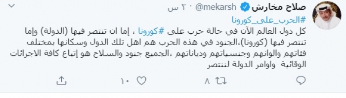 وكتب مخارش عبر تغريدة له على "تويتر" ر صدها "المشهد العربي":" كل دول العالم الآن في حالة حرب على كورونا ، إما أن تنتصر فيها (الدولة) وإما تنتصر فيها (كورونا)".
