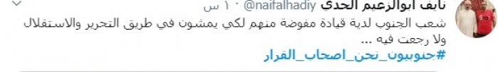 وكتب عبر سلسلة تغريدات رصدها "المشهد العربي":" شعب الجنوب لدية قيادة مفوضة منهم لكي يمشون في طريق التحرير والاستقلال ولا رجعة فيه".