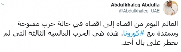 وصف الأكاديمي والسياسي الإماراتي عبدالخالق عبدالله، اليوم الأحد، مايحدث حول العالم بسبب انتشار فيروس كورونا بأنه "حرب عالمية ثالثة"