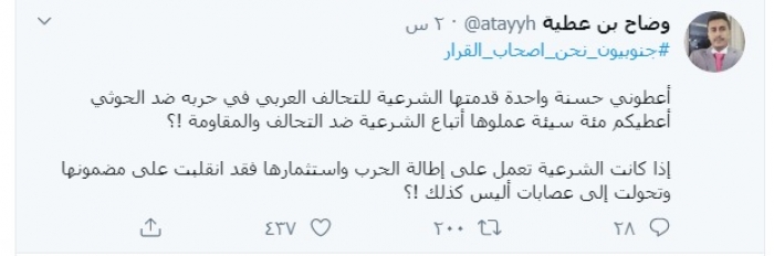 وكتب بن عطية عبر تغريدة له على "تويتر" رصدها "المشهد العربي" :" أعطوني حسنة واحدة قدمتها الشرعية للتحالف العربي في حربه ضد الحوثي أعطيكم مئة سيئة عملوها أتباع الشرعية ضد التحالف والمقاومة !؟".
