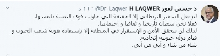 وكتب لقور عبر تغريدة له على "تويتر" رصدها "المشهد العربي":" لم يقل السفير البريطاني إلا الحقيقة التي حاولت قوى اليمننة طمسها".