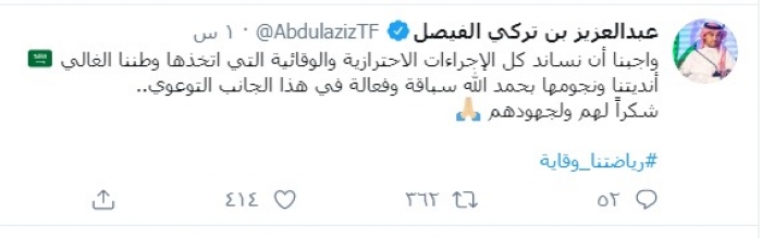 شدد الأمير عبد العزيز بن تركى الفيصل، وزير الرياضة السعودي، اليوم الأحد، بضرورة مساندة الإجراءات الوقائية التي اتخذتها المملكة لمواجهة كورونا.