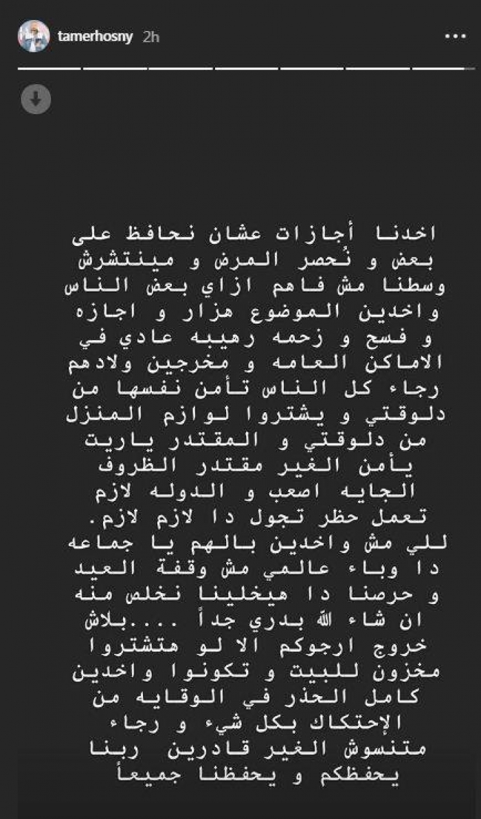 وكتب حسني، عبر خاصية (ستوري) على حسابه بـ"إنستجرام"، قائلاً: "أخدنا إجازات عشان نحافظ على بعض، ونحصر المرض مينتشرش وسطنا، مش فاهم بعض الناس واخدين الموضوع هزار وإجازة وفسح وزحمة رهيبة عادي".