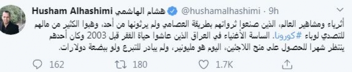 وقال في تغريدة عبر "تويتر" رصدها "المشهد العربي": "أثرياء ومشاهير العالم، الذين صنعوا ثرواتهم بطريقة العصامي ولم يرثونها من أحد، وهبوا الكثير من مالهم للتصدي لوباء كورونا".