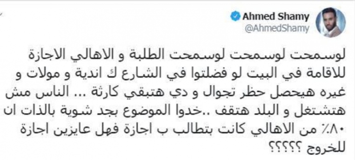 وكتب: "لو سمحت، الطلبة والأهالي الأجازة للإقامة في البيت، لو فضلتوا في الشارع كأندية ومولات و غيره هيحصل حظر تجوال، ودي هتبقى كارثة، الناس مش هتشتغل والبلد هتقف، خدوا الموضوع بجد شوية، بالذات إن ٨٠% من الأهالي كانت بتطالب بأجازة، فهل عايزين أجازة للخروج".