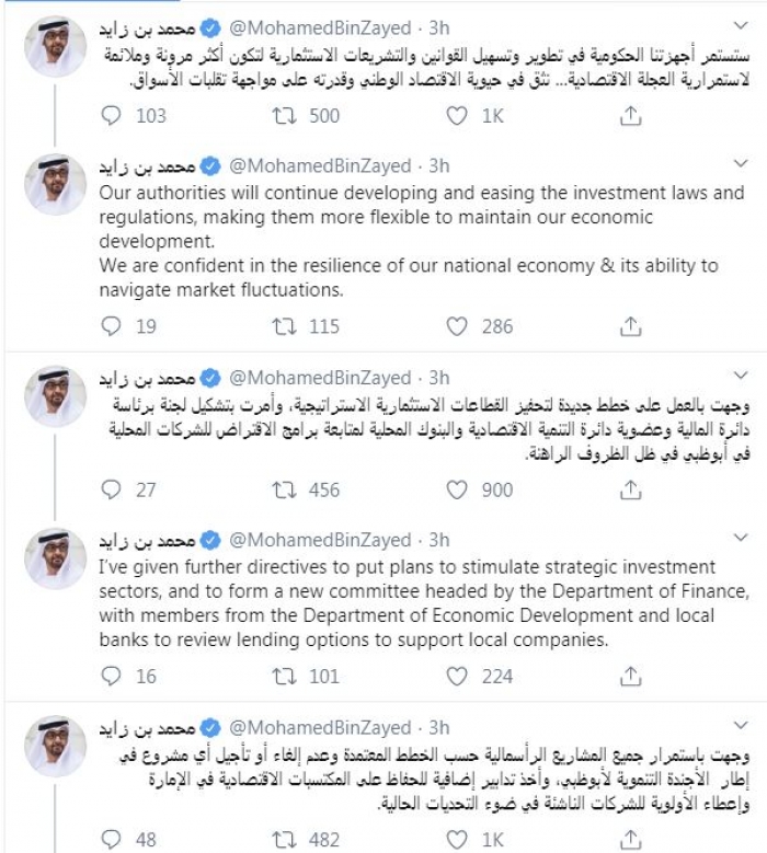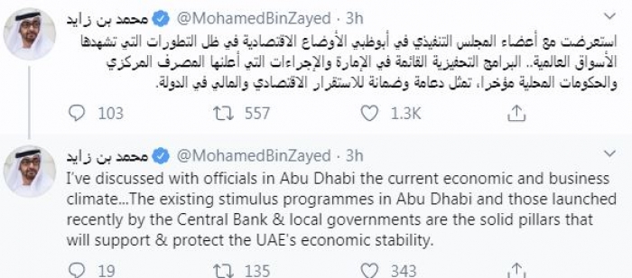 وقال "بن زايد" في سلسلة تغريدات عبر "تويتر" رصدها "المشهد العربي": "استعرضت مع أعضاء المجلس التنفيذي في أبوظبي الأوضاع الاقتصادية في ظل التطورات التي تشهدها الأسواق العالمية.. البرامج التحفيزية القائمة في الإمارة والإجراءات التي أعلنها المصرف المركزي والحكومات المحلية مؤخرا، تمثل دعامة وضمانة للاستقرار الاقتصادي والمالي في الدولة".