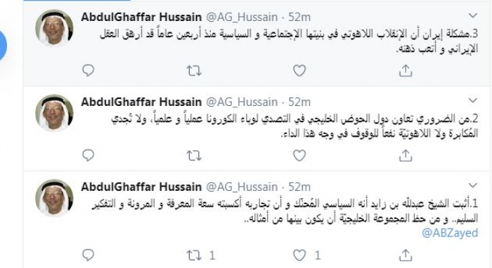 وقال في تغريدات عبر "تويتر" رصدها "المشهد العربي": "ثبت الشيخ عبدلله بن زايد أنه السياسي المُحنّك وأن تجاربه أكسبته سعة المعرفة والمرونة والتفكير السليم.. ومن حظ المجموعة الخليجيّة أن يكون بينها من أمثاله".