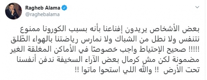 وكتب "علامة" عبر حسابه الرسمي بموقع تويتر: "بعض الأشخاص يريدون إقناعنا بأنه بسبب الكورونا ممنوع نتنفس ولا نطل من الشباك ولا نمارس رياضتنا بالهواء الطّلق".