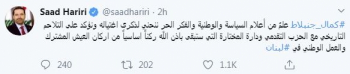 وقال في تغريدة عبر "تويتر" رصدها "المشهد العربي": "كمال جنبلاط علمٌ من أعلام السياسة والوطنية والفكر الحر ننحني لذكرى اغتياله ونؤكد على التلاحم التاريخي مع الحزب التقدمي ودارة المختارة التي ستبقى بإذن الله ركناً أساسياً من أركان العيش المشترك والعمل الوطني في لبنان".